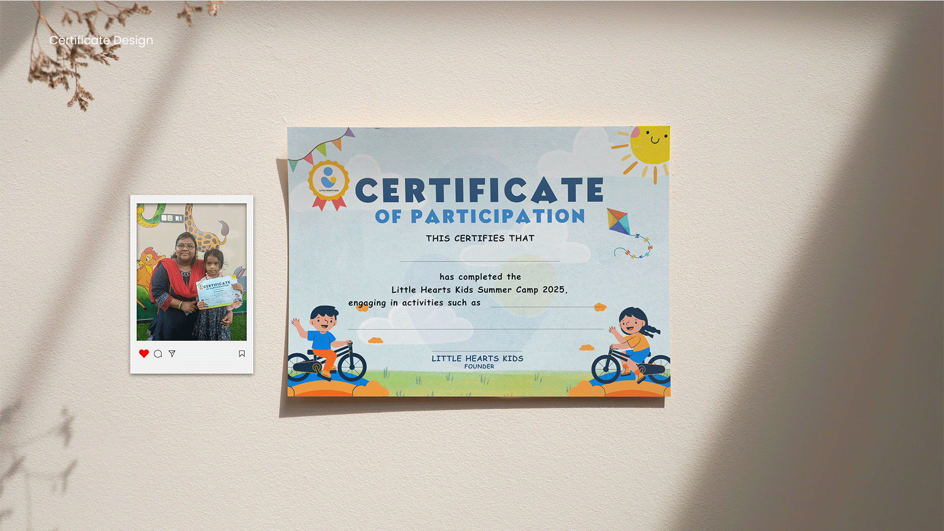 Participation and achievement certificates were designed with cheerful illustrations and soft colors, making children feel proud while maintaining official credibility for parents.
